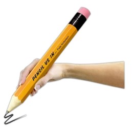 Here are some giant 14" long pencils that provide a full 9 /16" X 6" imprint area. These pencils are available in colors of black, white, kelly green, teal, light blue, metallic blue, metalic red, metallic purple, neon pink, standard yellow, metallic silver, neon orange and metallic gold. Minimum imprintable quantity is 250.