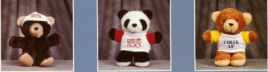We have many stock plush items in all shapes and sizes and they are readily available from one of our many locations throughout North America. We are presenting below just a few of the new items for 1998.