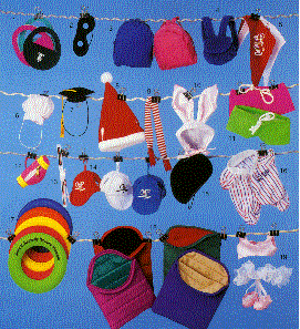 Pictured below are some of the accessories for our small plush animals. Picture from left to right starting at the top are; Visors, Halloween Mask, Backpack, Knapback, Bandana, Cook's Hat, Graduation Hat, Santa Hat, Christmas Scarf, Bunny Ears, Neon Shorts, Golf Bag, Skis, Baseball Cap, Cowboy Hat, Pajamas, Inner Tube, Sleeping Bag, Ballerina Outfit. Minimum total quantity is 72 however you can mix the accessories as long as the total is 72.