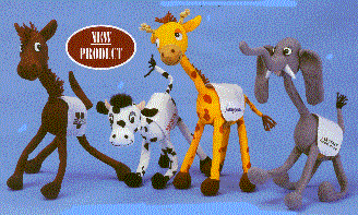 Here is a new item for 1998. These 12 " Bendables each with its own individual saddle blanket has an imprint area of 1 1/2" X 1 1/2". From left to right we have the four available bendables; Horse, Cow, Giraffe and Elephant. The minimum imprintable quantity is only 36.