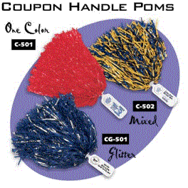 Perhaps the fastest growing market for pom pons is that of the Coupon Handle Poms. With an imprint area on the handle area of 2" X 1 3/8" plus a tear off tab imprint area of 1 1/8". These are 500 count streamers and we have lots of ideas how you can actualy get these for free by working with a local advertiser.Available in 24 Pom Pon streamer colors. Minimum order is 200.