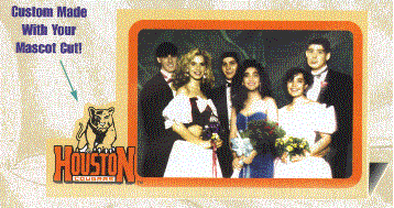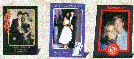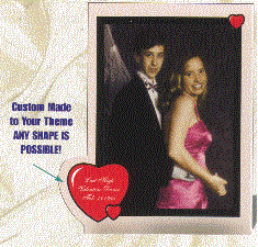 With over 20 stock Prom Frames available we can also custom design the frames with your school mascot, insignia, crest or other customized requests. Pictured on the left is an example of a custom frame with the school mascot on the left. The picture size is 4" X 6". On the right is a heart shaped frame motif with red, black and white background. Minimum on either of these items is only 100 pieces.