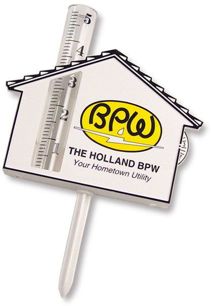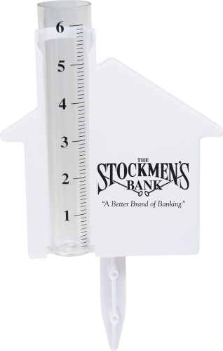 Measuring 5 3/4" X 5 3/8" X 1" the House shaped Rain Gauge has a 3" spike for sticking in the ground. Has key slots on back for mounting to various surfaces. Imprint area is 2 1/8" X 2 3/4". Minimum imprintable quantity is 150.