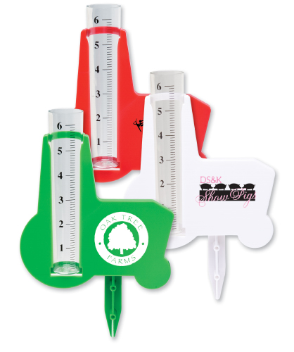 Measuring 6 3/4" wide X 10 1/4" high the Tractor shape Rain Gauge has a large imprint area of 3" wide X 2 3/4" high. Available in Green, Red or White. Minimum imprintable quantity is 250.
