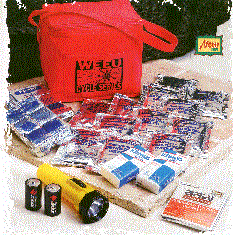 Our 6-Day Survival Kit has an insulated vinyl bag with convenient shoulder strap holds 6-day supply of emergeny food rations and 12 water pouches (5-year shel life, U.S. Coast Guard approved) plus first aid supplies, flashlight, 2 "D" batteries, 2 Kleenex tissue paackets, and survival blanket. The double zippered tote is refillable and can also be used as a cooler. Valuable gift or premium, especially popular in areas affected by hurricanes floods and earthquakes.