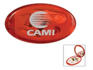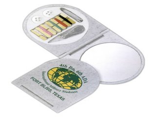 Compact mirror with sewing kit that contains 4 thread colors, button, safety pin, needle and threader plus mirror.The imprint area is 1" X 1 3/4" and the minimum imprintable quantity is 100.