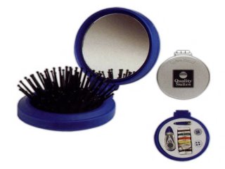 The Travel Brush Sewing Kit features a hairbrush that pops out for use then 'stuffs" into the case. The sewing kit unscrews from the base of the kit. The lid features a mirror. The compact size fits into any purse, glovebox or briefcase. The imprintable area is 1 1/2" diameter.Minimum imprintable quantity is 150.