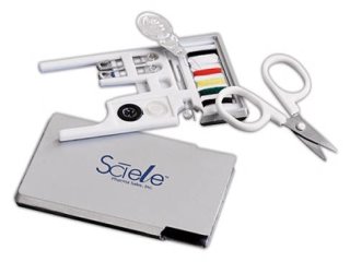This mini sewing kit is a great kit for frequent travelers. It comes in a conveniently packaged in a plastic case. The 13 piece set includes 1 black button, 1 white button, 2 safety pins, mini scissors, 1 needle threader, 1 straight pin amd thread of red, green, brown, blackyellow and white. The kit measures 3 1/2" X 2" X .1/4" and providesan imprint area of 1" X 2" on the case. Minimum order is 288.