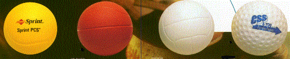 The left picture of the tennis ball the size is 2 1/2" diameter with an imprint area of 1 1/4" X 1". The basketball is 2 1/2" diameter and has an imprintable area of 1 1/4" X 1 1/4". The volleyball measures is 2 1/2" in diameter and can be imprinted ina 1 1/4" diameter area. The golf ball measures 1 1/4" and can be imprinted in an area of 1 1/4" diameter. The minimum imprintable quantity is 100.