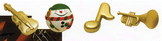 Did you know that any of our squeezable stress relievers can be made into ornaments ? Presented below on the left is the violin measuring 6 1/4" X 2 1/2" x 3/4" and the imprint area is 1 1/2" X 1". Next we have the snowman ball that measures 2 3/4" diameter and has an imprint area of 1 3/4" X 3/4". The 8th note measures 4 3/4" X 3" X 3/4" and the imprint area is 1" X 1/2". On the far right is the trumpet that measures 6" X 2 1/2" X 1" and the imprint area is 1" in diameter.Minimum imprintable quantity is 100.