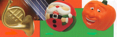 The original squeezable stress reliever was simply a round ball. Now there are hundreds of stress relievers that are available in all kinds of shapes and sizes and all can have your custom imprint. We are presenting below just a few of stress relief squeezables that we have available. If you wish our 30 page catalog on stress relievers please give us a call at 800 960-9080 or 206 285-5359 or email us at donace@promotionalproductsandideas.com or don_shepherdson8@msn.com We can also do custom shapes.