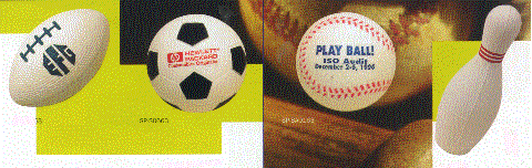 The white football measures 5" X 3" and is imprintable in an area of 1 3/4" X 1". The soccer ball is 2 1/2" in diameter and can be imprinted in an area of 1 1/4" diameter. The baseball measures 2 1/2" in diameter and can be imprinted in the 1 1/4" X 1" area. The bowling pin can be imprinted in a 1 3/4" X 1 3/4" area and its size is 2 1/2" X 1 3/4" X 7/8".