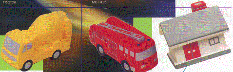 The cement mixer is 3 3/4" X 2 1/2" X 1 1/2" and can be imprinted in an area of 3/4" X 3/4". The fire truck measures 4" X 1 3/4" X 1 3/8" and the imprint area is 1" X 1/2". The house measures 3" X 2 1/4" X 1 3/4" and the imprint area is 1" X 1".