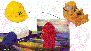 The hard hat is 3 1/2" X 2 3/4" X 1 3/4" and the imprint area is 1 3/4" X 1/2" X 1/2". The bulldozer measures 3 3/4" X 2 1/2" X 1 1/1/2" with an imprint area of 3/4" X 3/4". The gasoline truck (lower left) measures 4" X 2" X 1 3/4" and the imprint area is 1" X 1/2". The fire hydrant is 3 1/2" X 2 1/2" X 1 1/4" and the imprintable area is 1" X 1/2". Minimum imprintable quantity is 100.