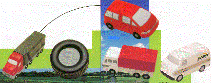 On the left is a semi-truck measuring 5" X 3/4" X 1" with the imprint area being 1 3/4" X 1/2". Next is the tire stress reliever with a size of 2 3/4" X 2" and the imprint area is 2 5/16" diameter minus 1" X 13/16". The van measures 4" X 1 3/4" X 2" and the imprintable area is 1 1/4" X 3/4". Under the van picture is the delivery truck measuring 4 1/4" X 2" X 1/2" and an imprintable area of 1 3/4" X 3/4". Minimum imprintable quantity on any of these is 100.