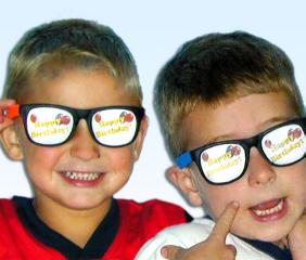 Presented below are pictures of custom imprinted lens with the imprint visible only to the person looking at the wearer of the sunglasses. When you wear the sunglasses you can see thru them without the imprinted lens being visible.These are a great way to attract attention for your business, product, team or organization.The lenses are made from shatterproof polycarbonate, and block 100% of UVA and UVB. Any design you may want to print can be put on the lenses and also the temple of the sunglasses can be imprinted. They are available in either traditional Black frames or color frames. Both Adult and Kids sunglasses are available. Minimum imprintable quantity is 150.