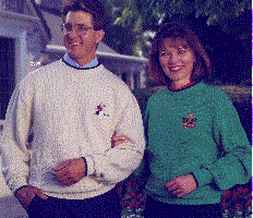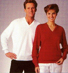 In our next picture the sweaters are our 100 % combed cotton "Moss & Panels". The Moss and Panels refer to the two different stitch configuarations used in this sweater. We feature textured stitches on the body and sleeves highlighted by a contrasting cuff and color trim color. A very classy sweater that measures up with today's market trends. These sweaters are also easy care, machine wash and dry. The available colors are body of Bone with a Navy cuff and Collar trim, Jade body with Navy cuff and collar trim, White body with black cuff and collar trim and Navy body with burgundy cuff and collar trim.