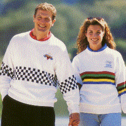 The Racing Stripe Sweater on the left is a 100% pre-shrunk combed cotton, heavyweight jersey knit, black and white checkerboard racing stripe across chest and arms, ribbed crew neck, elastized ribbed cuffs and waistbands, T-sleeve. The lady on the right is wearing an Olympic Stripe 100% pre-shrunk combed cotton, heavyweight jersey knit, five color stripe across chest and arms, ribbed crew neck, elasticzed ribbed cuffs and waistband, T-sleeve.