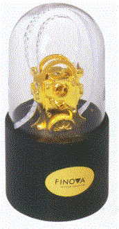 This Stock Market Ticker replica is gold-plated and has paper ticker tape printed with authentic code symbols. It is mounted on a black base and protected under a glassdome that is 4" diameter X 7 3/4" overall. There are two gold-plated oval plates recessed into opposite sides of the base. The front plate states "Replica-The Stock Market Ticker-Circa 1909" The plate on the other side is for a company's logo and message.