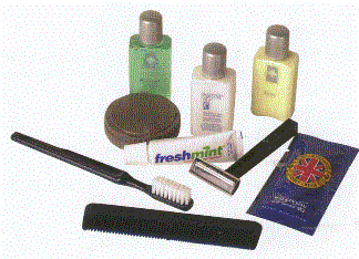 We have many combinations of amenties that are available to be put into a travel kit of your choice. The Envoy collection pictured below features the Le Classique Conditioning Shampoos, Le Classique Ltion, Le Classique Mouthwash, Toothbrush, Freshmint Toothpaste Tube, Comb, Twin Blade Razor, Wilkenson Shave Cream Packet and Shoe Polisher. Minimum order is 100 units.