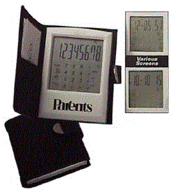 The compact unit features World time in 16 major cities, day and date display calculator, 2 currency conversion memories, 3 programmable alarms, key time sound, and 12/24 hour display. The unit comes with leather like case with silver stylus pointer, has a flip-up easel back for desk usage and large 1" numerals. The batteries are included. It has an imprintable area of 2" wide X 1" high and the minimum imprintable quantity is 25.