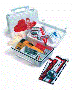 This unique, watertight case contains many useful safety items. Perfect for the car, RV, or boat. It has special holes to be hung on the wall. It contains an emergency blanket, flashlight with red safety cone attachment (requires 2 "D" batteries, not included), distress flag, 10 antiseptic towelettes, 6 Bayer aspirin aspirin packets, scissors, adhesive tape, 6 first aid cream packets, gauze, 6 Telfa pads, 24 adhesive strips and 1 pair latex gloves. The case size is 10" wide X 7" high X 3 1/8" in depth. The imprint area on the cover is 7 /.2" wide X 5" with the minimum imprintable order being only 25.