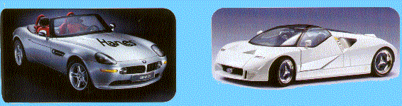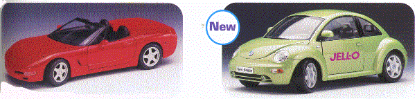 9" to 12" these highly detailed die cast precision models can have your custom imprint. The die cast metal bodies have plastic parts, opening doors and hoods with full functioning steering. Has adjsutable seat back on most models and four wheel suspension. Detailed chassis with separate exhaust system. All replica cars come with a display stand. Imprint area is 1" X 1" on hood or door of most cars. Over 36 different vehicles are available. Minimum imprintable quantity is 25 and price varies depending upon the vehicle selected. Call 800 759-1223, ext. 2233 for list of available vehicles. Pictured below is a replica of the BMW Z8 on the left and on the right is the Ford GT90.