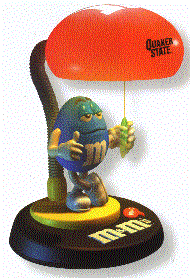 Bring fun to your desk with this colorful M&M's Brand Character lamp. M&M's Brand blue character holds the integrated on/off switch rope, which activates sound chip. The size is 17" X 8" X 8" and an imprint area of 1" X 2". In the minimum quantity of 25 the price is $ 48 each. Set-up charges and freight must also be added.