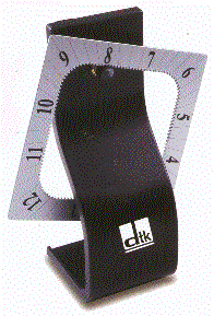 The revolutionary way to tell time. The disc revolves around center post as time passes. The overall size is 2 1/4" wide X 7" high X 1/4" diameter. The imprint area is 1 1/2" wide X 7/8" high. uses an AA battery (not included) Minimum imprintable quantity is 50. Price is $ 11.95 plus set-up charge and freight.