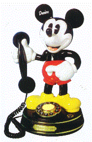 When the phone rings there are 5 custom phrases in Mickey's original voice. Also Mickey's arm and head move when the phone rings. It has a switchable ringer, last number redial and is tone pulse switchable. It requires 2 "D" batteries (not included) It measures 10" X 15" X 8" and provides a custom imprintable area of 1" X 2". In the minimum custom imprintable quantity of 25 it is $ 113.00 each plus set-up charge and freight.