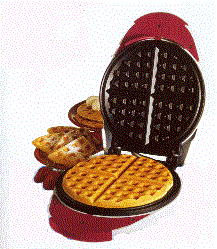 This Waffle iron measures 7" X 4" X 10" and it has an imprint area of 2" X 2". It features a traditional round grid., preheat/ready light., nonstick easy- clean griddle. It is a compact and can be stored upright. Also has a cord wrap and nonslip grip feat. Minimum imprintable quantity is 25 and they are $ 46.50 each and a set-up charge and freight must also be added.