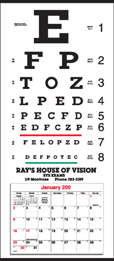 The Vision Chart Calendar measures 11" X 25" and provides an imprintable area for your custom message of 9" X 1 1/2" which can provide up to four lines of imprint. The calendar is a single imprinted sheet with a twelve month, tear-off pad attached. Tinned top and bottom with a loop for hanging. Minimum imprintable quantity is only 100.