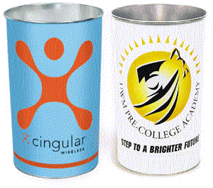 Our custom imprinted Wastebaskets with a imprintable minimum of only 36 provide a colorful way for businesses, schools and organizations to have a colorful imprintable reminder of their branding. The Wastebaskets are made from high quality electrolytic tinplate material and are available in either a 19 1/4" high X 10"diameter size that provides an imprintable area of 18 1/2" high X 30" wide or the Tapered size of 15" high X 10 1/4" diameter. which has an imprintable size of 14" high X 24" wide The imprint can wrapped around the wastebasket. Please note that they are also available with an imprinted Basketball backboard or Football Goal post. The larger wastebasket also has a sand urn made from spun aluminium to fit on the top of the wastebasket. The sand urn also comes with 1/2 pound of sand.. For current pricing and information you are invited to call us at 800 960-9080 or 206 285-5359 or email:donace@promotionalproductsandideas.com or don_shepherdson8@msn.com