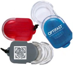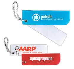 This Magnifier is a 4X magnifiery that comes with a key chain. It measures 1" X 1/4" X 2" and provides an imprint area of 2 1/4" X .69". Available in Blue or Red. Less than $ 1.90 each in the minimum of 100.