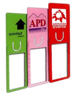 This 7 7/16" X 2 5/8" magnifier is also a handy bookmark, page holder and ruler.It provides an imprintable area of 2" X 2". In the minimum of 250 it is less than $ 1.60 each.