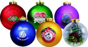 The round 3 1/4" shatterproof satin finished Holiday ornaments can be custom imprinted for your business, school or organization. Great product for Fundraisers, Store decorations, Keepsakes, Family reunions, Employee gifts, Customer appreciation, Wedding favors and Company parties. Available in ornament colors of Gold, Blue, Red, White, Green , Purple and Clear. The imprint area on the ornament is 1 3/4" in diameter All ornaments come in a Happy Holiday gift box or a plain box.. Have a question call us at 800 960-9080 or email us at donace@promotionalproductsandideas.com